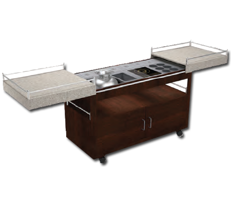Live counter designed to create dosas, suitable for outdoor catering applications with storage provided beneath the counter with in-built heating & mobility.